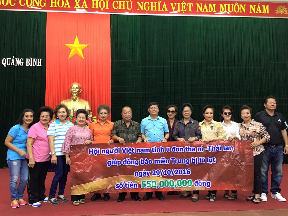 (VOVworld) - หลังจากได้ทราบข่าวเกี่ยวกับอุทกภัยในภาคกลางเวียดนาม ชมรมชาวเวียดนามในประเทศไทยได้รณรงค์เปิดรับบริจาคเงินช่วยเหลือผู้ประสบอุทกภัย บนเจตนารมณ์แห่งการช่วยเหลือจุนเจือกัน ตามข้อมูลของสถานทูตเวียดนามประจำประเทศไทย จนถึงวันที่ 1 พฤศจิกายนปี 2016 ชาวเวียดนามในประเทศไทยได้บริจาคเงินเกือบ 3.9 พันล้านด่ง รวมทั้งเงินช่วยเหลือของสมาคมชาวเวียดนามที่อาศัยในประเทศไทยสาขาต่างๆ เช่นสมาคมชาวเวียดนามในกรุงเทพฯ สมาคมชาวเวียดนามในจังหวัดเชียงใหม่ สมาคมชาวเวียดนามในจังหวัดชัยภูมิ สมาคมมิตรภาพไทย เวียดนามและสมาคมนักธรุกิจไทย เวียดนาม เป็นต้น โดยเฉพาะเมื่อวันที่ 31 ตุลาคมที่ผ่านมา สมาคมชาวเวียดนามในจังหวัดอุบลราชธานีได้รับสิ่งของช่วยเหลือจากนายสมศักดิ์ จังตระกุล. ผู้ว่าราชการจังหวัดอุบลราชธานี คือเสื้อผ้า 400 ชุดเพื่อให้การช่วยเหลือผู้ประสบอุทกภัยในภาคกลางเวียดนาม ซึ่งน้ำใจของชาวเวียดนามในประเทศไทยเป็นสิ่งที่ไม่สามารถประเมินค่าได้ ดังความเห็นของนาง เหงียน ถิ ซวน แอง ครูชาวเวียดนามในจังหวัดอุดรธานี ที่แต่งเป็นบทกวีเมื่อวันที่ 23 ตุลาคม โดยมีความหมายว่า