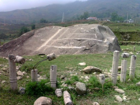 ที่หุบเขาเหมื่องฮวายังมีลานศิลสโบราณที่สลักตัวอักษรและลวดลายโบราณ ทั้งนี้ทำให้หุบเขาแห่งนี้กลายเป็นจุดนัดพบของนักโบราณคดีชาวเวียดนามและชาวต่างชาติตลอดจนนักท่องเที่ยวอีกด้วย มีแผ่นศิลาหลากหลายขนาดเล็กบ้างใหญ่บ้างประมาณ ๒๐๐ แผ่นที่สลักรูปที่ให้ความรู้สึกลึกลับ แผ่นศิลาเหล่านี้อยู่กระจัดกระจายบ้างอยู่ใต้ร่มไม้หรืออยู่กับใบหญ้า บ้างก็อยู่ตามตลิ่งหรือไร่นา ลวดลายสลักเหล่านี้ยังไม่สามารถระบุที่มาและความหมายได้ ปัจจุบัน ลานศิลาสลักโบราณนี้ถูกขึ้นทะเบียนเป็นมรดกระดับชาติและเป็นมรดกพิเศษของชาวเวียดโบราณ คุณด่าวถิ่ถุ่ยญูงไกด์นำเที่ยวแนะนำว่า “ แผ่นศิลาอยู่กระจัดกระจายในหลายที่ แต่มากที่สุดคือที่ลานสองแห่งได้แก่ ลานที่อยู่ใกล้บ้านโฟ ที่เป็นหมู่บ้านของชนเผ่าม้งและตั้งอยู่ตอนล่างของลำน้ำฮวา ที่นี่มีแผ่นศิลาขนาดใหญ่จำนวนมากที่สุด มีศิลาบางแผ่นกว้าง ๑๒ เมตร และมีรูปสลักหลากหลาย ลานที่สองอยู่ที่บริเวณติดกับตำบลเหิ่วถ่าวและลาวจ๋าย มีศิลากว่า ๑๐๐ แผ่น ซึ่งเป็นลานหินที่ใหญ่ที่สุดและแผ่นศิลาก็มีรูปแกะสลัดไม่ซ้ำกันด้วย ”