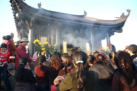 | พุทธศาสนิกชนหลั่งไหลมาทำบุญที่วัดด่ง หรืวัอวัดทองแดงบนยอดภูเอียนตื๋๋อ ( mytour.vn ) |