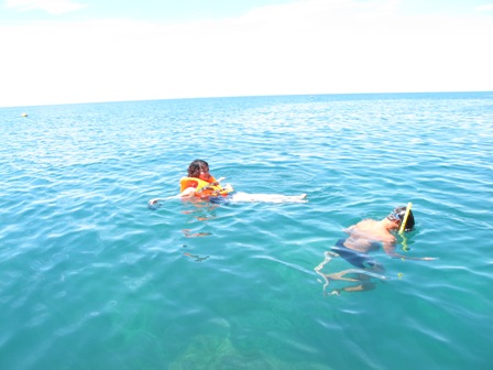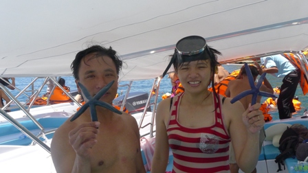 การดำน้ำชมปะการังคือไฮไลท์ของทัวร์เที่ยวเกาะกู่ลาวจ่ามและได้รับความนิยมจากนักท่องเที่ยว โดยเฉพาะนักท่องเที่ยวต่างชาติ โดยมีการจัดพื้นที่สำหรับการดำน้ำและมีการดูแลเป็นอย่างดีจากฝ่ายกู้ภัย คุณจูงแจกชุดดำน้ำได้แก่ เสื้อชูชีพ แว่นตาและท่ออากาศ ไปพลางคุยกับพวกเราไปว่า “ ที่นี่มีปะการังชนิดหนึ่งที่ได้ระบุในสมุดปกแดงคือ ปะการังซอนโมยหรือลิปสติกและมีหลากหลายชนิดแต่พบมากคือปะการังช่องหนามและปะการังอ่อน พอดำน้ำเราจะพบดาวทะเลสีเขียวหรือสีขมิ้นที่สามารถจับมันเอามาชมเสร็จต้องปล่อยมันคืนสู่ทะเล ที่นี่ยังมีหอยชนิดต่างๆไม่ว่าจะเป็นหอยเม่นหรือหอยเซลลานา คุณ โกโร นักท่องเที่ยวชาวสเปนรู้สึกสนุกที่ได้ดำน้ำชมปะการัง สัมผัสปะการังและชมปลาหลากหลายสีสัน คุณโกโรกล่าวว่า “ ทิวทัศน์สวย สิ่งแวดล้อมสะอาด พวกเราได้อาบแดด ตอนดำน้ำดิฉันได้ชมปลาและดาวทะเลที่กำลังว่ายน้ำน่ารักมาก เกาะนี้ช่างสวยจริงๆ ดิฉันรู้สึกสนุกมากที่ได้ร่วมทัวร์นี้ ได้พักผ่อนหย่อนอารมณ์ ”