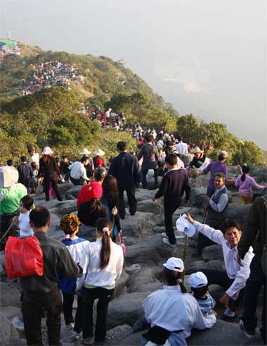ในวันที่ท้องฟ้าใสโปร่ง เมื่อยืนบนยอดภูเอียนตื๋อทอดสายตาออกไปจะมองเห็นภาพเทือกเขาดงเจี่ยวที่มีทั้งป่าซาก ทิวต้นสนและป่า conifers ส่วนในช่วงต้นฤดูใบไม้ผลิต บริเวณนี้จะถูกปกคลุมด้วยเมฆหมอก แต่เราจะได้สัมผัสบรรยากาศอันอบอุ่นและศักดิ์สิทธิ์ของเทศกาล ท่ามกลางอากาศเย็นยะเยือก คนเข้าแถวยาวเหยียดเพื่อขึ้นบันไดหินแต่ละชั้นไปยังยอดภูเอียนตื๋อที่มีวัดด่งประดิษฐานอยู่ เพื่อแสดงความเคารพนับถือต่อพระพุทธและขอพรให้ประสบแต่โชคดีในปีใหม่นี้ คุณฝ่ามถิ่ห่ง นักศึกษาปีที่ ๔ มหาวิทยาลัยแห่งหนึ่งในกรุงฮานอยกล่าวถึงความรู้สึกมีความสุขที่ได้มาที่นี่ตรงกับวันเปิดงาน โดยกล่าวว่า “ วันนี้ดิฉันได้ปีนขึ้นบันไดจนถึงวัดด่งเพื่อขอพรให้ครอบครัวประสบแต่ความสุขและโชคดี ส่วนดิฉันเมื่อเรียนจบจะได้มีงานทำ มีผู้แก่ผู้เฒ่าสามารถปินบันไดจนถึงวัดด่งได้ ดิฉันก็ต้องพยายามทำให้ได้ เช่นกัน ”