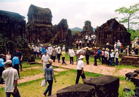 ท่ามกลางแสงแดดที่ร้อนอบอ้าว นักท่องเที่ยวยังหลั่งไหลมาเที่ยวหมีเซินอย่างไม่ขาดสาย พอเหยียบเท้าเข้าไปในโบราณสถานหมีเซินเราได้สัมผัสกับความเย็นสบาย เสียงจั๊กจั่นร้องดังทั่วบริเวณกลุ่มปราสาทหมีเซินทำให้บรรยากาศที่เงียบสงบ ณ ที่นี่คึกคักมากขึ้น ทั้งนี้ทำให้เรารู้สึกตื่นเต้นมากขึ้น นักท่องเที่ยวชาวเยอรมันแสดงความชื่นชอบที่ได้มาเที่ยวหมีเซินว่า “ นับเป็นครั้งแรกที่ผมมาที่นี่ ผมชอบทิวทัศน์ที่นี่มาก ปราสาทหมีเซินเป็นสถาปัตยกรรมที่โดดเด่นและสวยมาก ”