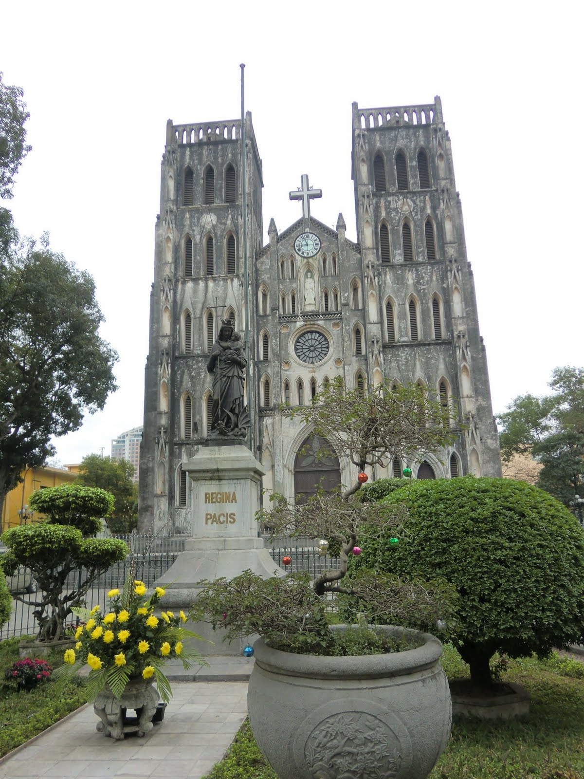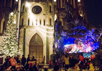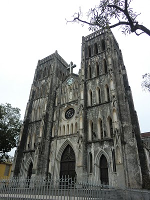 (VOVworld)- ถ้าหากวัดTrấn Quốcและวัดเสาเดียวมีสถาปัตยกรรมแบบพุทธศาสนาและเอชียตะวันออกแบบดั้งเดิมแล้ว โบสถ์ใหญ่ฮานอยก็ถือเป็นสถาปัตยกรรมแบบยุโรปที่มีลวดลายแกะสลัก ลงชาดฉาบทองอย่างสวยสดงดงามและมีการผสมผสานเอกลักษณ์วัฒนธรรมพื้นบ้านของเวียดนามเข้าไว้ด้วย โบสถ์แห่งนี้ได้รับการออกแบบและควบคุมการก่อสร้างโดยบาดหลวงปักกินเน่อร์ซึ่งเป็นศิลปะแบบโกธิค มีประตูใหญ่ตรงระเบียงทางเข้าสู่อาคารที่ขนาบด้วยประตูเล็กทั้งสองข้าง ส่วนภายในโบสถ์ก็ใช้กระจกสีตกแต่งเป็นภาพนักบุญต่างๆ สำหรับบริเวณที่บาดหลวงใช้ทำพิธีได้รับการตกแต่งตามศิลปะพื้นบ้านดั้งเดิมมีลวดลายสวยงามปราณีต ส่วนห้องหลักมีรูปปั้นพระเยซูที่ทำจากเซรามิคสูงกว่า๒เมตร นายNguyễn Đình Cấp ชาวคริสต์ในจังหวัดBắc Giang ที่มาร่วมพิธีคริสต์มาสในโบสถ์ใหญ่ฮานอยได้๓๐ปีแล้วกล่าวว่า“โบสถ์ใหญ่ฮานอยเป็นหนึ่งในโบสถ์ที่เก่าแก่และสวยงามที่ สุดในเวียดนาม ที่นี่มีหอระฆังสองหอและห้องฟังเทศน์ขนาดใหญ่ ที่นี่มีบาดหลวงTrịnh Như Khuê ซึ่งเป็นพระคาดินัลคนแรกของเวียดนามที่มีความซื่อสัตย์และความอดทนและเป็นผู้นำสูงสุดของคริสต์ศาสนาภาคเหนือเวียดนามมานานถึง๒๕ปี พระคาดินัลTrịnh Như Khuê ได้ชี้นำชาวคริสต์ให้เคารพในพระเยซูเจ้าและปฏิบัติหน้าที่ของพลเมืองที่รักชาติ”