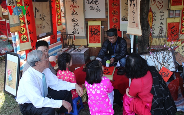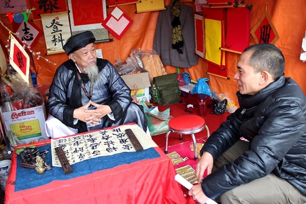 ตั้งแต่วันตรุษเต๊ตที่2 คนเวียดนามทุกเพศทุกวัยโดยเฉพาะคนรุ่นใหม่ก็เริ่มไปขอตัวอักษรเพื่อความเป็นศิริมงคลในต้นปีใหม่จนกลายเป็นกระแสความนิยมใหม่ โดยผู้ที่เป็นนักเขียนตัวอักษรล้วนเป็นปัญญาชนที่มีความรู้ด้านภาษารวมทั้งภาษาฮั่นโนมที่เป็นอักษรเวียดนามในสมัยศักดินา นายเหงวียนวันโท จากสโมสรศิลปะลายพู่กันเฟืองนามกล่าวถึงความหมายของตัวอักษรมงคลต่างๆว่า ถ้าครอบครัวไหนขอคำว่า “ฟุก” คืออยากสั่งสอนลูกหลานให้รู้จักรักใคร่กันเพื่อให้ชีวิตมีความผาสุก ส่วนคำว่า “ดึ๊ก” คือเตือนให้ทุกคนต้องใช้ชีวิตที่ดีทำดีปฏิบัติดีและมีจิตใจที่ดีต่อคนอื่น ส่วนผู้ใหญ่ชอบขออักษรที่สื่อความหมายให้อายุยืนนาน คนค้าขายขอคำว่า “โหลก”หรือ “ฮึง” ซึ่งหมายถึงโชคลาภและความรุ่งเรือง ใครชอบคำไหนก็จะมาขอเพื่อให้มีความเหมาะสมกับครอบครัว