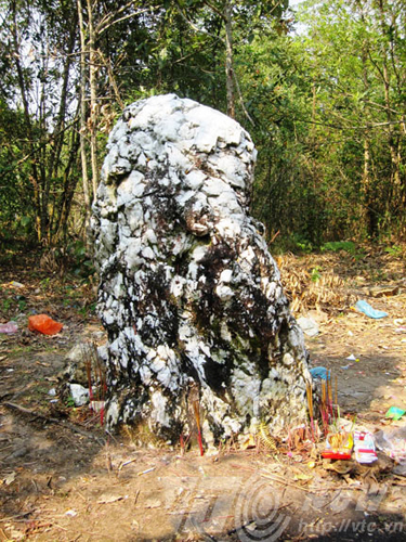 ตามคำเล่าขานของชาวท้องถิ่น ไม่มีใครรู้ว่าบนยอดเนินดินนี้ปรากฎก้อนหินที่เป็นแร่เขี้ยวหนุมานสีขาวใส ความสูงประมาณ1.7เมตรนี้ตั้งแต่เมื่อไหร่ โดยเมื่อมองใกล้ๆก้อนหินดูขรุขระไม่ราบเรียบ แต่เมื่อมองจากไกลๆก็เหมือนรูปผู้เฒ่ากำลังนั่งคิดหน้าตาซึมเศร้าหันหน้ามองไปที่ลำธารที่ไหลลัดเลาะใต้เชิงเขา ชาวห่าญี่ในท้องถิ่นได้เล่าลือกันเรื่องตำนานที่ลี้ลับต่างๆเกี่ยวกับการอพยพของชนเผ่าห่าญี่เมื่อครั้งโบราณกาลว่า ตามประเพณีการทำนาแบบเลื่อนลอย เมื่อเรือกสวนไร่นาหมดความอุดมสมบูรณ์ ชาวห่าญี่ก็จะอพยพไปหาที่ดินทำการผลิตใหม่เพื่อตั้งหลักแหล่งอาศัยใหม่ มีสามีภรรยาคู่หนึ่งที่ในระหว่างการเดินทางไปหาแผ่นดินใหม่ ภรรยาลืมผ้าคลุมหัวไว้ที่บ้านเก่าก็เลยข้ามลำธารกลับไปเอาแต่พอดีเกิดน้ำป่าไหลหลากหลายวัน สามีของนางไปตามหาไม่เจอก็นั่งรอด้วยความซึมเศร้าอยู่ริมลำธารแล้วตายกลายเป็นก้อนหินขาวนี้ ซึ่งเหมือนเป็นหลักแดนธรรมชาติที่อยู่ห่างจากเส้นพรมแดนเวียดนาม-จีนเพียง1เมตร ห่างจากเส้นทางลาดตระเวนชายแดน20เมตร