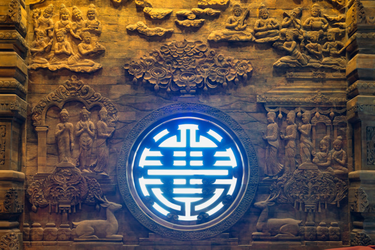 ส่วนในวิหารตามเท้บูชาพระพุทธรูป3องค์ที่เป็นตัวแทนของพระพุทธเจ้าในอดีต-ปัจจุบัน-อนาคต มีพื้นที่กว่า3พันตารางเมตร มีสองชั้นและพระพุทธรูปแต่ละองค์หนักกว่า80ตัน สิ่งที่น่าสนใจภายในวิหารตามเท้คือภาพผนังวิหารที่ประกอบจากภาพแกะสลักหิน1หมื่น2พันภาพเกี่ยวกับพุทธประวัติ พระมหาเถระทิกมิงห์กวาง เผยว่า“วิหารชั้นแรกมีภาพแกะสลักหินจากภูเขาไฟอินโดนีเซียและโดยฝีมือชั้นเยี่ยมของช่างแกะสลักชาวมุสลิมอินโดนีเซีย วิหารชั้นสองบูชาพระโคตมพุทธเจ้า ซึ่งมีพระพุทธรูปหนัก150ตัน และภายในวิหารก็มีภาพแกะสลักหินที่บรรยายพุทธประวัติ ส่วนวิหารชั้นสามคือวิหารกวนอิมที่มีองค์แม่กวนอิมทองแดงขนาดใหญ่หนักกว่า150ตัน”