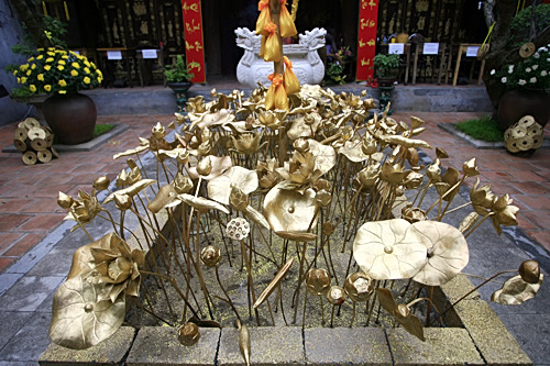 ความอลังการของงานอยู่ที่วัดกิมเงินเลขที่ ๔๒ ถนนห่างบาก ซึ่งเป็นสถานที่บูชาบรรพบุรุษผู้สร้างอาชีพทำเครื่องประดับเงินและทอง โดยมีกิจกรรมต่างๆเพื่อเชิดชูอาชีพพื้นเมืองไม่ว่าจะเป็นงานนิทรรศการจัดแสดงผลิตภัณฑ์ที่ประณีตสวยงามจากฝีมือของช่างศิลป์ถนนห่างบากและช่างศิลป์จากหมู่บ้านดิ๋งกงกรุงฮานอยและหมูบ้านโจว์เค ด่ายบ๊ายจังหวัดบั๊กนิงห์ อีกทั้งยังจัดแสดงเครื่องแลคเกอร์ของหมู่บ้านศิลปาชีพห่าท้ายและจ่างเซินกรุงฮานอยด้วย นอกจากนี้ยังมีงานนิทรรศการเกี่ยวกับโบราณสถานศาลเจ้ากิมเงิน โดยศาลเจ้ากิมเงินถูกสร้างขึ้นเมือปลายศตวรรษที่ ๑๕ ถึงต้นศตวรรษที่ ๑๖ เพื่อบูชาบรรพบุรุษแบ๊กเหง่หรือบรรพบุรุษผู้สร้างอาชีพ ๑๐๐ อาชีำำพของย่านโบราณ ๓๖ สาย และตั้งอยู่บนถนนเก่าแก่ห่างบากมีสถาปัตยกรรมที่โดดเด่นสวยงามมักจะถูกใช้เป็นสถานที่จัดกิจกรรมพื้นเมืองเพื่อเชิดชูศิลปาชีพ ซึ่งได้กลายเป็นจุดนัดพบของนักท่องเที่ยวชาวเวียดนามและชาวต่างประเทศเมื่อมาเที่ยวฮานอยและย่านโบราณ ๓๖ สาย นายหวูแหม่งห่าย นายกสมาคมช่างศิลป์และนายกสมาคมศิลปะการทำเครื่องประดับเงินและทองฮานอยเผยว่า “ ศาลเจ้ากิมเงินเป็นสถานที่บูชาบรรพบุรุษผู้สร้างอาชีพหัตถกรรมพื้นเมืองของเมืองหลวงตั้งแต่ศตวรรษที่ ๑๓ สถานที่แห่งนี้เป็นที่ก่อเกิดอาชีพหัตถกรรมพื้นเมืองโบราณ ช่างศิลป์ผู้มีชื่อเสียงหลายท่านได้ทำงานที่นี่และสร้างเป็นศาลเเจ้าเพื่อบูชาบรรพบุรุษ การที่วัดได้รับการรับรองเป็นโบราณสถานทางประวัติศาสตร์และวัฒนธรรมจะมีส่วนร่วมยืนยันสถานะของฮานอยและวัด อีกทั้งช่วยส่งเสริมและพัฒนาอาชีพนี้ให้คงอยู่กับนครหลวงตลอดไป