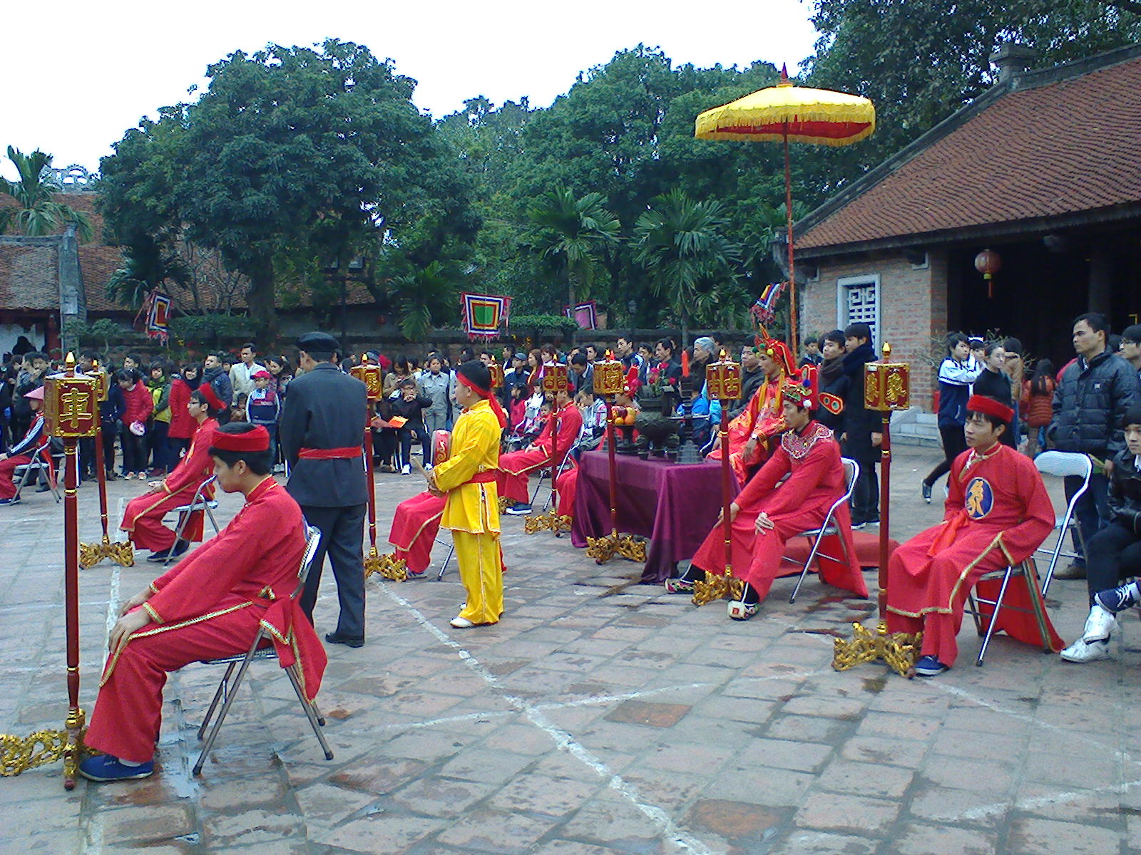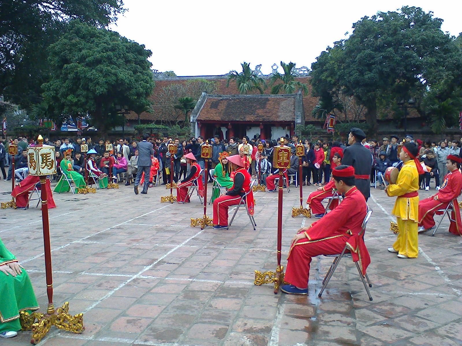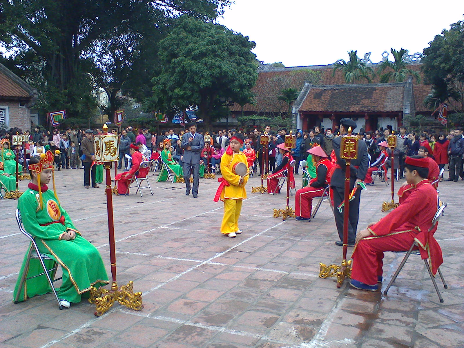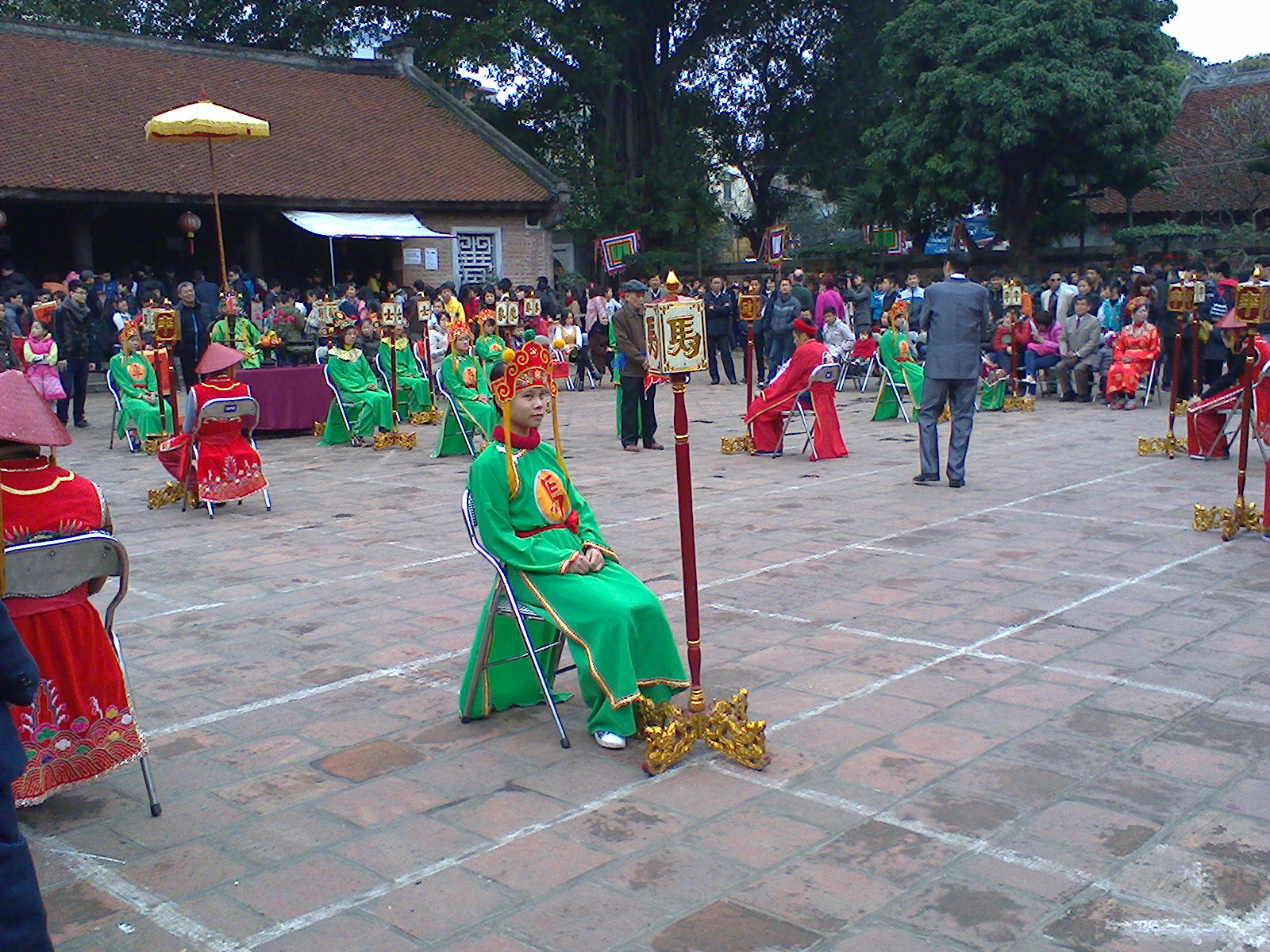 สนามกลางแจ้งในตัวเมืองอาน เญิน จังหวัดบิ่นห์ดิ่นห์ถูกจำลองเป็นเวทีกระดานหมากรุกขนาดใหญ่ เมื่อกระดานจริงเดินหมากตัวใด ปี่พาทย์ก็จะบรรเลงเพลงให้สมฐานะของหมากตัวนั้น และตัวหมากในสนามก็จะเดินหรือรำศิลปะการป้องกันตัวตามลีลาจังหวะของเพลงเป็นที่สนุกสนาน ซึ่งเสียงที่ท่านกำลังรับฟังอยู่ขณะนี้คือ การเล่นหมากรุกคนที่กำลังเป็นไปอย่างเมามันท่ามกลางเสียงตีกลองเชียร์ดังลั่นไปทั่วบริเวณ ชายหนุ่มผู้สวมบทเป็นเบี้ยสวมใส่เครื่องนุ่งห่มสีเขียวกำลังร่ายรำศิลปะการป้องกันตัวกับสาวที่ใส่เครื่องนุ่งห่มสีแดงและสามารถหลีกเลี่ยงเกมของฝ่ายแดงได้อย่างฉลาด จึงได้รับการเชียร์จากบรรดาผู้ชมด้วยความศรัทธา