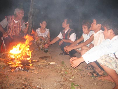 | นั่งล้อมวงรอบกองไฟฟังขับบทกวีมหากาพย์เตยเงวียน ( เวินแอง ) |