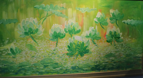 ด้านผลงานภาพลงรักขัดเงาของจิตรกร บุ่ยจ๋องยือ มีชื่อว่า “บัวขาว” “บัวเขียว” “บัวชมพู” “สระบัว” “ดอกบัวกับปลา” ทำให้ผู้ชมได้สัมผัสกับบรรยากาศแบบดั้งเดิมที่มีความเรียบง่ายของดอกบัวที่มักพบเห็นทั่วไปในชีวิตประจำวัน ส่วนจิตรกรหญิง ฟานถิแทงมาย ภาพสีน้ำมันชุด “สระบัว”หรือ “ดอกบัวเดือนพฤษภาคม”และ “ดอกบัวกับสาวน้อย” ได้สะท้อนให้เห็นถึงความบริสุทธิ์เรียบง่ายและความละเอียดอ่อน รองศ.ดร.เหงวียนวันฮวี รองผู้อำนวยการศูนย์วิจัยและส่งเสริมคุณค่ามรดกวัฒนธรรมกล่าวว่า“ทุกภาพที่นำมาจัดแสดงครั้งนี้ได้สร้างมุมมองที่หลากหลายเกี่ยวกับดอกบัวรวมทั้งสะท้อนถึงอารมณ์และฝีมือของจิตรกรที่ชื่นชมความงดงามบริสุทธิ์ของดอกบัว ซึ่งภาพเหล่านี้ได้ช่วยให้นึกถึงประธานโฮจิมินห์ กรุงฮานอยและคิดถึงสิ่งที่งดงามต่างๆ”