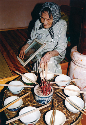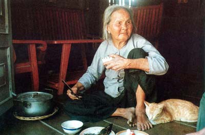 อีกภาพหนึ่งเกี่ยวกับคุณแม่ทื้อ ซึ่งชีวิตของท่านได้กลายเป็นตำนาน เป็นอนุสาวรีย์แห่งความรักชาติและความเสียสละ คุณแม่ทื้อเป็นคุณแม่วีรชนเวียดนามของจังหวัดกว่างนามที่มีลูกเสียชีวิตในสงครามต่อต้านนักล่าเมืองขึ้นฝรั่งเศสและสงครามต่อต้านอเมริกาผู้รุกราน โดยสามี ลูกทั้ง ๙ คน ลูกเขย ๑ คนและหลาน ๒ คนของท่านได้จากท่านไปอย่างไม่มีวันกลับเพื่อเอกราชของประเทศ ผลงาน คอยลูกกลับมาของช่างภาพเจิ่นห่งได้ทำให้ผู้ชมหลายคนกลั้นน้ำตาไม่อยู่ นายเจิ่นห่งคุยกับพวกเราว่า เมื่อเขาถ่ายภาพคุณแม่ทื้อนั้น ใบหน้าที่อดทนของท่านยังสะท้อนความหวังว่าสักวันจะมีลูกคนใดคนหนึ่งในจำนวน ๙ คนจะกลับมา และท่านได้เสียชีวิตไปเมื่อมีอายุ ๑๐๗ ปีโดยไม่ได้พบลูกแม้แต่คนเดียว