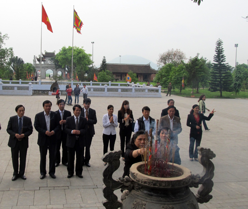 | บรรดาผู้แทนเข้าร่วมพิธีจุดธูปถวายแด่บรรพกษัตริย์หุ่ง ( Phu Tho online ) |