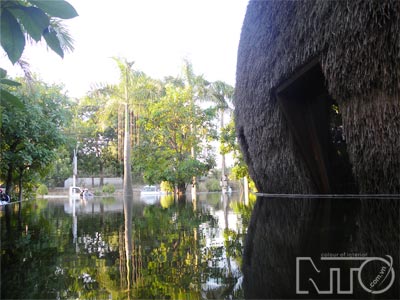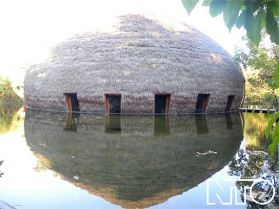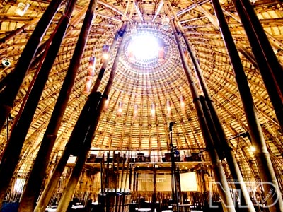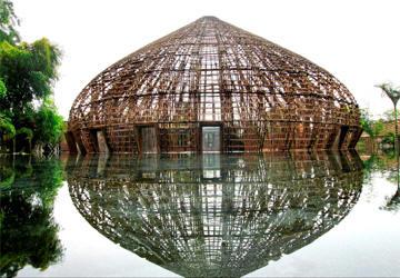 การสร้างร้าน “ บาร์กาแฟรับสายลมและน้ำ ” ใช้ไม้ไผ่เป็นวัสดุหลักเพื่อเป็นมิตรกับสิ่งแวดล้อม บ้านนี้รับสายลมเย็นและไผ่เป็นอุปกรณ์ส่งน้ำเข้าบ้านซึ่งคล้ายๆกับเครื่องปรับอากาศธรรมชาติ ภายในบ้านได้รับการตบแต่งด้วยผลิตภัณฑ์จากไผ่ไม่ว่าจะเป็นตัวผับ โต๊ะ เก๊าอี้ จาน โคมไฟแขวน ซึ่งได้สร้างบรรยากาศแห่งความเป็นธรรมชาติ สถาปนิกหวอจ๋องเงียะเผยว่า “ ไผ่เป็นวัสดุที่มีขนาดไม่แน่นอนจึงยากที่จะสร้างเป็นโครงสร้างใหญ่ แต่เมื่อเราสามารถพิชิตมันแล้วก็จะเป็นโครงสร้างที่แปลกกว่าสิ่งปลูกสร้างด้วยคอนกรีตหรือเหล็ก จุดเด่นของไผ่อยู่ตรงคุณสมบัติที่สามารถโค้งงอได้ทำให้สิ่งปลูกสร้างมีความสวยงามกว่าสิ่งปลูกสร้างอื่นๆ ”