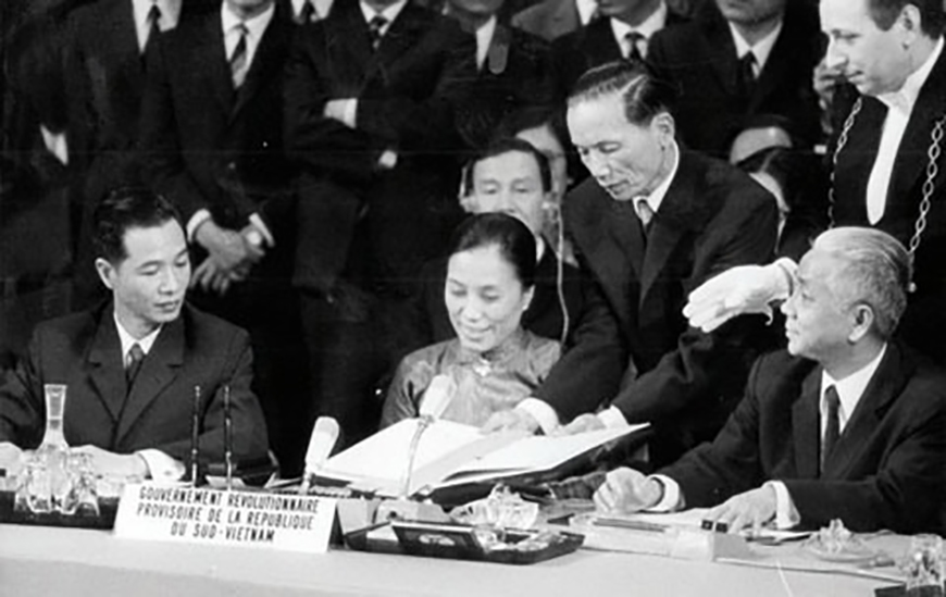 นาง เหงียนถิบิ่งห์ รัฐมนตรีว่าการกระทรวงการต่างประเทศของรัฐบาลปฏิวัติเฉพาะกาลสาธารณรัฐภาคใต้เวียดนามลงนามข้อตกลงปารีสเมื่อวันที่ 27 มกราคมปี 1973 |