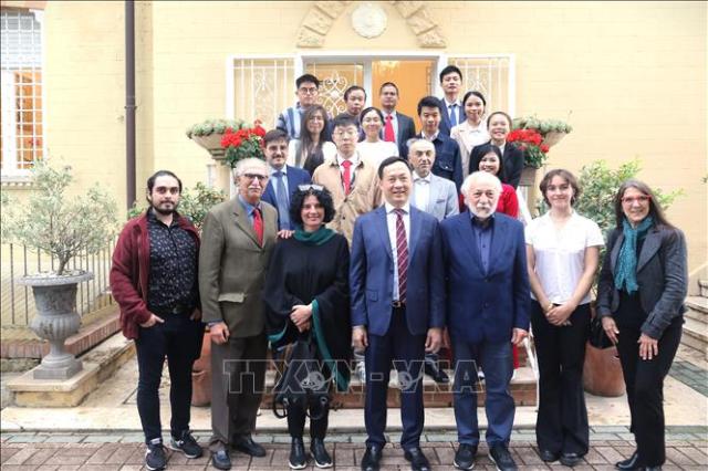Đại sứ Việt Nam tại Italy Dương Hải Hưng chụp ảnh lưu niệm với các đại biểu tham dự Hội thảo. Ảnh: TTXVN |