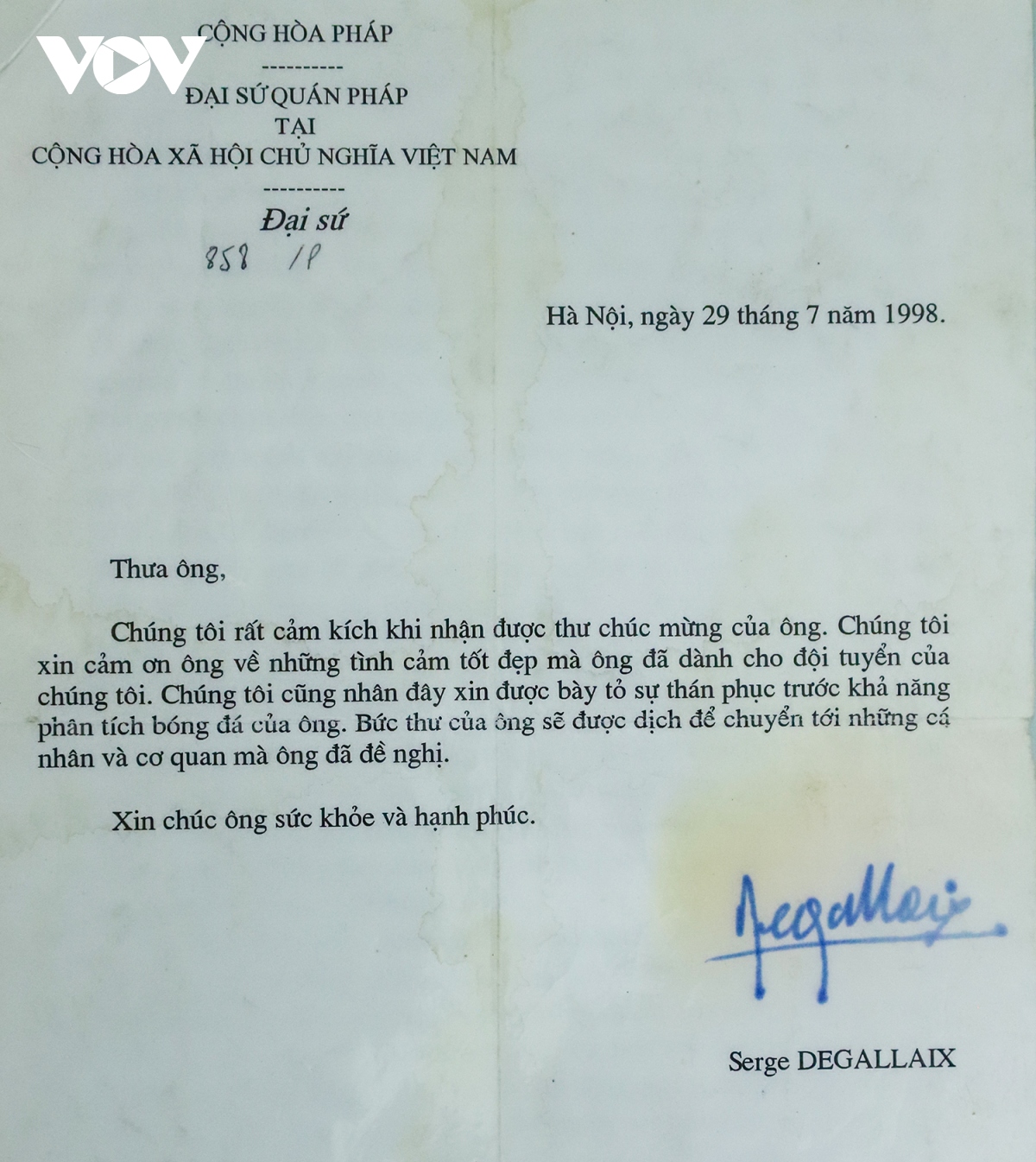 Bức thư được gửi đi. Kết quả các trận đấu không ngoài nhận định của ông Trần Ngọc Tú, chỉ có tỷ số trận chung kết Pháp thắng tới 3-0, ngoài sức tưởng tượng. Ngày 29/7/1998, Đại sứ nước Cộng hoà Pháp tại Việt Nam lúc đó, ông Serge Degallaix đã gửi thư phúc đáp cho ông Tú. Bức thư viết bằng tiếng Việt.