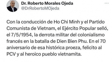 70 năm chiến thắng Điện Biên Phủ: Cuba chúc mừng Đảng và nhân dân Việt Nam
