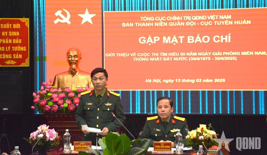 Sáng 13/2, tại Hà Nội, Ban Thanh niên Quân đội và Cục Tuyên huấn (Tổng cục Chính trị Quân đội nhân dân Việt Nam) tổ chức gặp mặt báo chí giới thiệu cuộc thi tìm hiểu 50 năm Ngày giải phóng miền Nam, thống nhất đất nước (30/4/1975 - 30/4/2025).