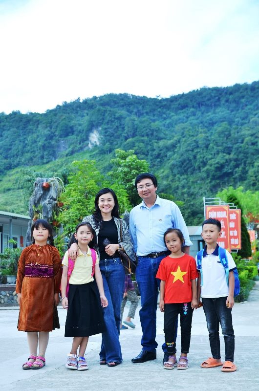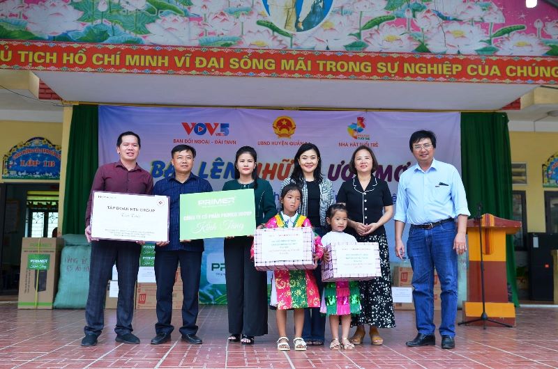Ông Vũ Đức Lợi, đại diện HTH Group; bà Thịnh Thị Liên, TGĐ Cty CP Primer Group; NSƯT Ánh Tuyết, Trưởng đoàn ca múa nhạc Nhà hát Tuổi trẻ; ông Hoàng Hướng, Phó Bí thư Đảng ủy VOV5 và các thầy cô giáo, các em học sinh trường Phổ thông dân tộc bán trú tiểu học Tùng Vài |