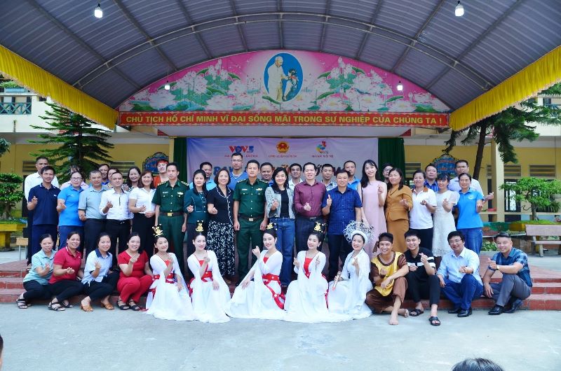 Các nghệ sĩ, diễn viên của Nhà hát Tuổi trẻ, các phóng viên của VOV5, các nhà tài trợ, các chiến sĩ đồng Biên phòng Tùng Vài và các thầy cô giáo trong ngày vui ở Quản Bạ |