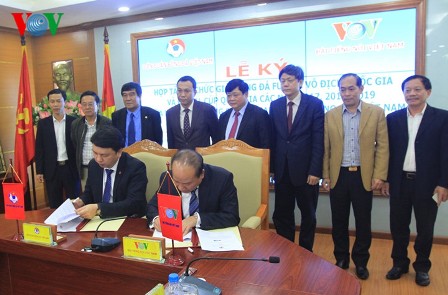 | Phó Tổng giám đốc VOV Trần Minh Hùng và Tổng thư ký VFF Lê Hoài Anh ký kết hợp tác. |