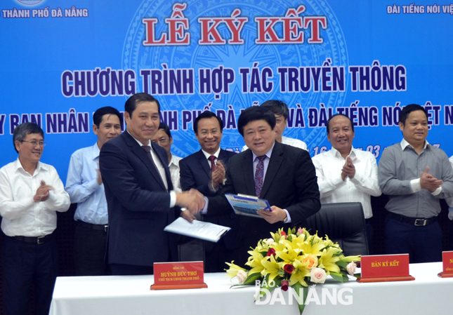 | Chủ tịch UBND thành phố Huỳnh Đức Thơ và Tổng Giám đốc Đài Tiếng nói Việt Nam Nguyễn Thế Kỷ ký kết chương trình hợp tác truyền thông (Ảnh: baodanang.vn) |