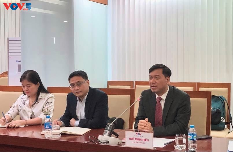 Tại buổi tiếp, Phó Tổng Giám đốc Ngô Minh Hiển giới thiệu tóm tắt những nét chính về các đơn vị của Đài TNVN cũng như hoạt động tuyên truyền và hợp tác quốc tế của Đài TNVN trong gần 80 năm qua.