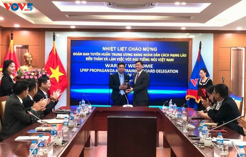 Ông Ngô Minh Hiển, Phó Tổng Giám đốc VOV, tặng quà ông Sakhone Phommalath, Phó trưởng Ban Tuyên huấn Trung ương Đảng Nhân dân Cách mạng Lào.