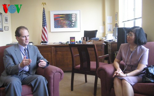 | Nhà báo Hoàng Minh Nguyệt trong buổi làm việc với Phó phát ngôn Ngoại giao Mỹ ngày 1/8/2007 về việc Đài TNVN đặt Cơ quan thường trú tại Hoa Kỳ. |
