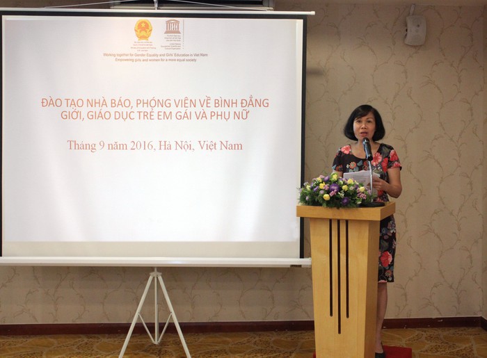 | Bà Hoàng Minh Nguyệt, Điều phối các chương trình Thông tin Truyền thông của UNESCO phát biểu tại một khóa tập huấn. |