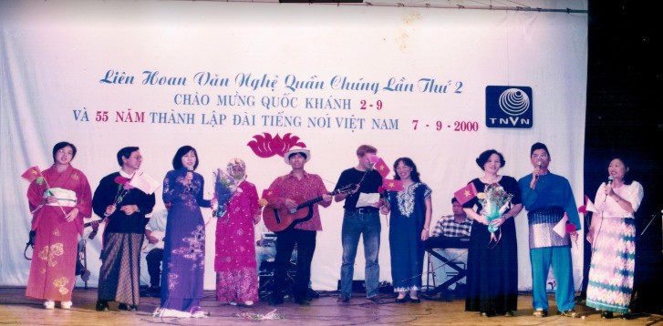 | Nhà báo Hoàng Minh Nguyệt tham gia biểu diễn văn nghệ với Ban HTQT |