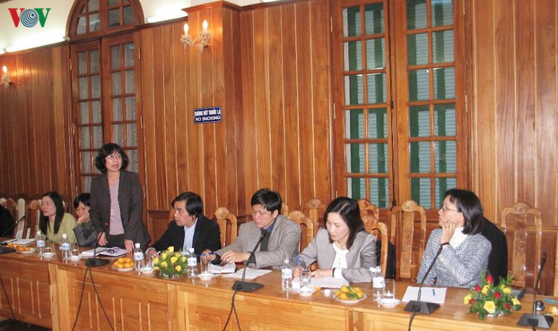 | Nhà báo Hoàng Minh Nguyệt (người đứng) tại một hội thảo khoa học của Đài TNVN. |