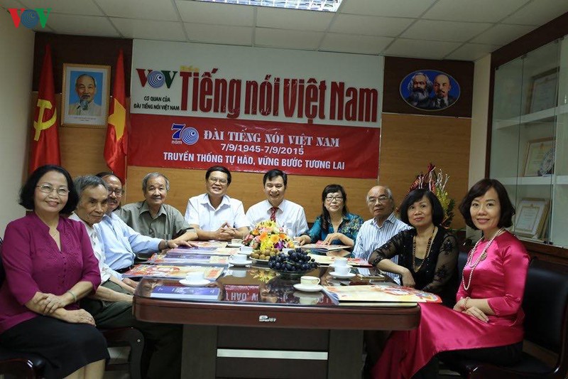 | Nhà báo Hoàng Minh Nguyệt cùng các thế hệ lãnh đạo Báo Tiếng nói Việt Nam. |