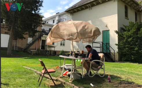 | Paul hướng dẫn về các thiết bị nghe đài của mình với phóng viên VOV. |