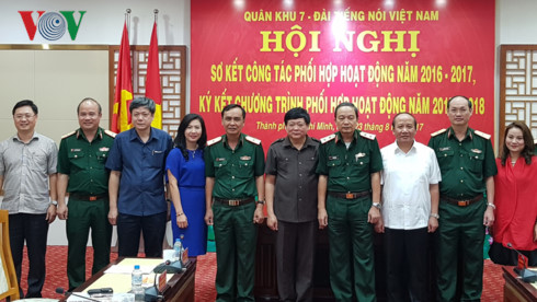 Chiều 23/8, tại TP HCM, Đài Tiếng nói Việt Nam (VOV) và Bộ tư lệnh Quân khu 7 tổ chức sơ kết hoạt động kết nghĩa với năm 2016 - 2017 và ký kết Chương trình phối hợp hoạt động năm 2017 - 2018. Ông Nguyễn Thế Kỷ, Ủy viên Trung ương Đảng, Tổng Giám đốc VOV và Trung tướng Phạm Văn Dỹ, Chính ủy Quân khu 7 đồng chủ trì hội nghị.