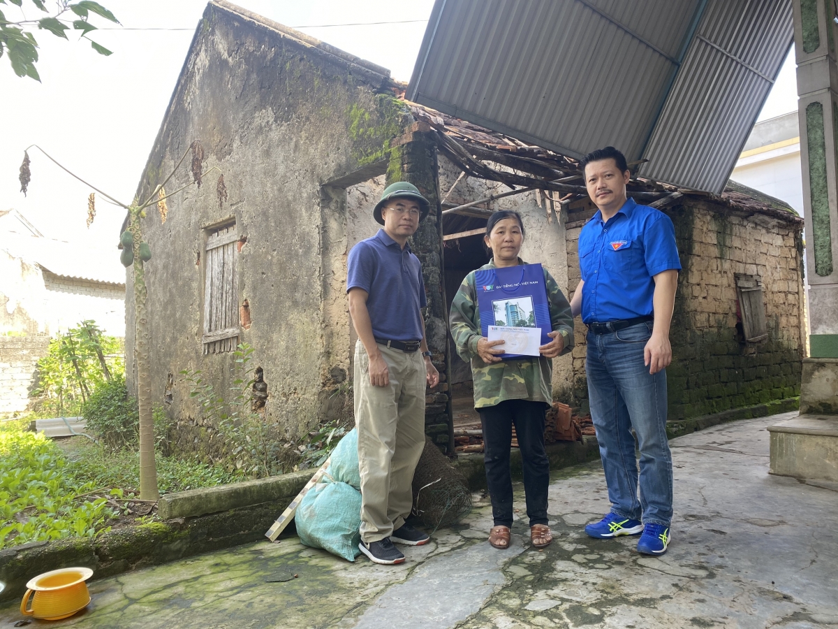 Bí thư Đoàn Thanh niên VOV Bùi Thị Lan Anh trao tặng tiền mặt và các món quà cho người dân Yên Thành, Nghệ An.