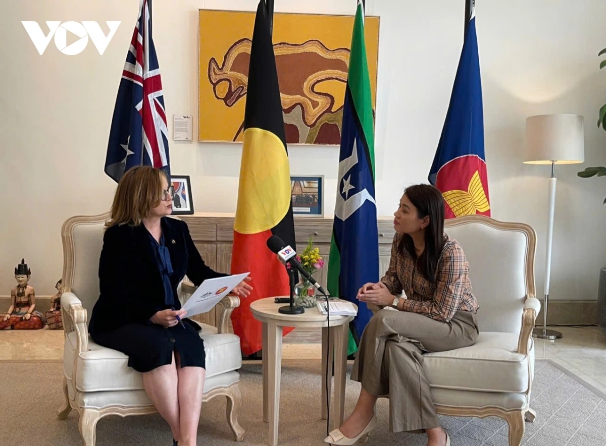 Đại sứ Australia tại ASEAN Tiffany McDonald trả lời phỏng vấn của phóng viên VOV tại Jakarta về Diễn đàn tương lai ASEAN 2025. Ảnh: VOV |