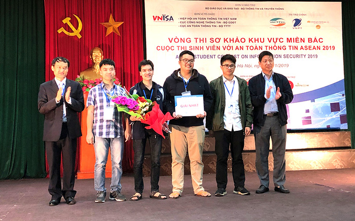 Ông Vũ Quốc Khánh, Phó Chủ tịch kiêm Tổng thư ký VNISA và ông Chu Minh Yên, Phó Giám đốc Học viện Kỹ thuật mật mã trao giải Nhất khu vực miền Bắc cho đội thi Đại học công nghệ tại Vòng sơ khảo cuộc thi này năm 2019. -Ảnh: ictvietnam.vn |