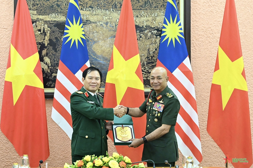 Thượng tướng Nguyễn Tân Cương trao quà lưu niệm tặng Đại tướng Tan Sri Datuk Seri Mohammad bin Ab Rahman. Ảnh: Việt Trung/qdnd.vn