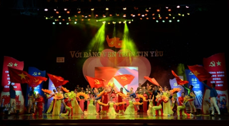 | Các nghệ sĩ biểu diễn liên khúc hát múa “Chào mừng Đảng Cộng sản Việt Nam”. Ảnh: Nguyên Thắng |