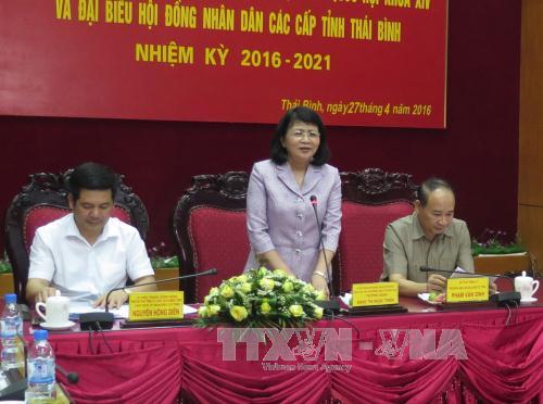 Phó Chủ tịch nước Đặng Thị Ngọc Thịnh đánh giá cao việc tỉnh Nam Định chủ động, khẩn trương triển khai đồng bộ, đúng luật các công việc chuẩn bị bầu cử sắp tới. Phó Chủ tịch nước lưu ý thời gian tới, tỉnh cần tiếp tục làm tốt công tác tuyên truyền để người dân hiểu rõ nghĩa vụ, quyền lợi của mình đối với việc đi bỏ phiếu là góp phần xây dựng nhà nước pháp quyền thật sự là của dân, do dân và vì dân; phấn đấu 100% cử tri trong tỉnh trực tiếp đi bỏ phiếu; tổ chức tốt công tác tiếp xúc cử tri của các ứng cử viên để bảo đảm đúng luật, công bằng trong quá trình vận động bầu cử; tiếp tục tăng cường công tác kiểm tra, giám sát, nhất là trong ngày bầu cử. Cùng ngày, Phó Chủ tịch nước, Phó Chủ tịch Hội đồng Bầu cử quốc gia Đặng Thị Ngọc Thịnh kiểm tra công tác bầu cử tại tỉnh Thái Bình. Ủy ban bầu cử tỉnh Thái Bình cho biết tỉnh có 11 người đủ tiêu chuẩn ứng cử đại biểu Quốc hội và 114 người đủ tiêu chuẩn ứng cử đại biểu Hội đồng nhân dân tỉnh. Ủy ban Bầu cử tỉnh đã chủ động xây dựng phương án giới thiệu người ứng cử đại biểu Quốc hội và đại biểu Hội đồng nhân dân tỉnh, kịp thời lập danh sách công bố người ứng cử tại các đơn vị bầu cử trên các phương tiện thông tin.