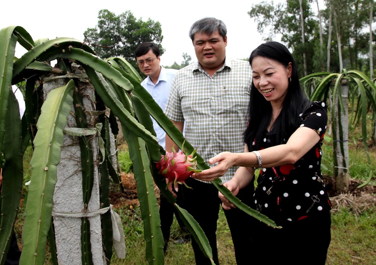 Bà Hoàng Thị Thúy Lan thăm mô hình trồng Thanh Long ruột đỏ của gia đình anh Nguyễn Văn Hòa, thôn Cầu Thao, xã Xuân Hòa (Lập Thạch). Ảnh Nguyễn Lượng