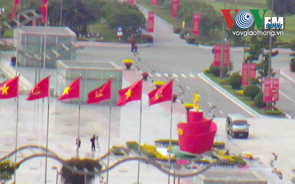 | Cờ Đảng, cờ Tổ quốc tung bay phấp phới tại Trung tâm hội nghị Quốc gia tạo một không khí trang nghiêm. Trong ảnh: Tại cổng Trung tâm Hội nghị Quốc gia nhìn từ Camera VOV Giao thông |