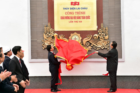 | Thủ tướng Nguyễn Tấn Dũng gắn biển Công trình Thủy điện Lai Châu chào mừng Đại hội Đảng toàn quốc lần thứ XII |