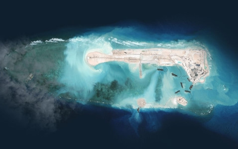 | Hình ảnh vệ tinh Trung Quốc cải tạo phi pháp bãi Chữ Thập ở Biển Đông. Ảnh AP |