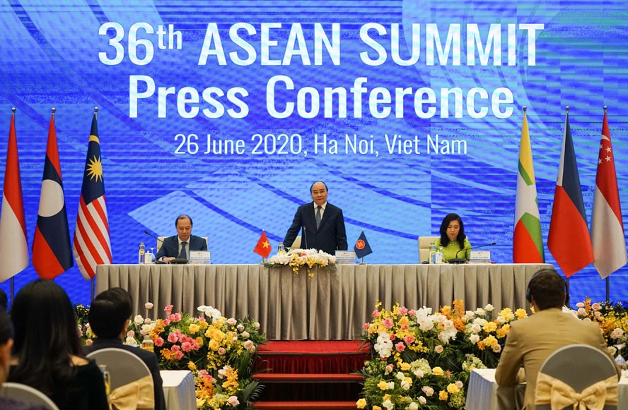 Thủ tướng Chính phủ Nguyễn Xuân Phúc, trên cương vị Chủ tịch ASEAN 2020, chủ trì buổi họp báo quốc tế kết thúc hội nghị ngày 26/6/2020. - Arnh: Báo Hà Nội mới. |