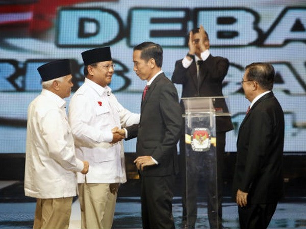 | Hai ứng cử viên tổng thống Indonesia, ông Prabowo Subianto và ông Joko Widodo (phải) bắt tay trước cuộc tranh luận trên truyền hình. (Nguồn: JP) |