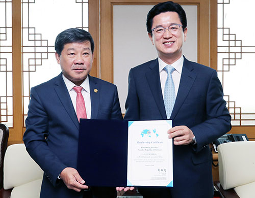 Ông Trần Thanh Liêm (trái), Chủ tịch UBND tỉnh, nhận quyết định chứng nhận chính thức trở thành thành viên của WTA từ ông Her Tae Jeong, tân Thị trưởng thành phố Daejeon, Chủ tịch WTA - Ảnh: tuoitrebinhduong.vn |
