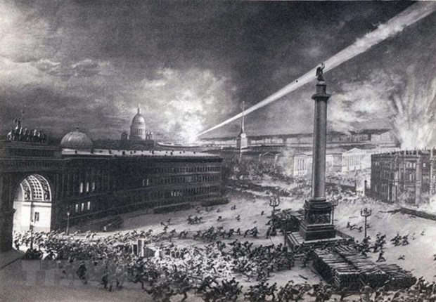 Đêm 7/11/1917 (25/10 theo lịch Nga cũ), quân khởi nghĩa tấn công vào Cung điện mùa Đông ở Petrograd, mở đầu cuộc Cách mạng Tháng Mười Nga. Ảnh: Tư liệu TTXVN |