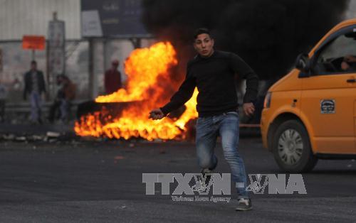 Người biểu tình Palestine ném đá vào binh sĩ Israel tại thành phố Nablus, Khu Bờ Tây ngày 10/12. - Ảnh: THX/ TTXVN |